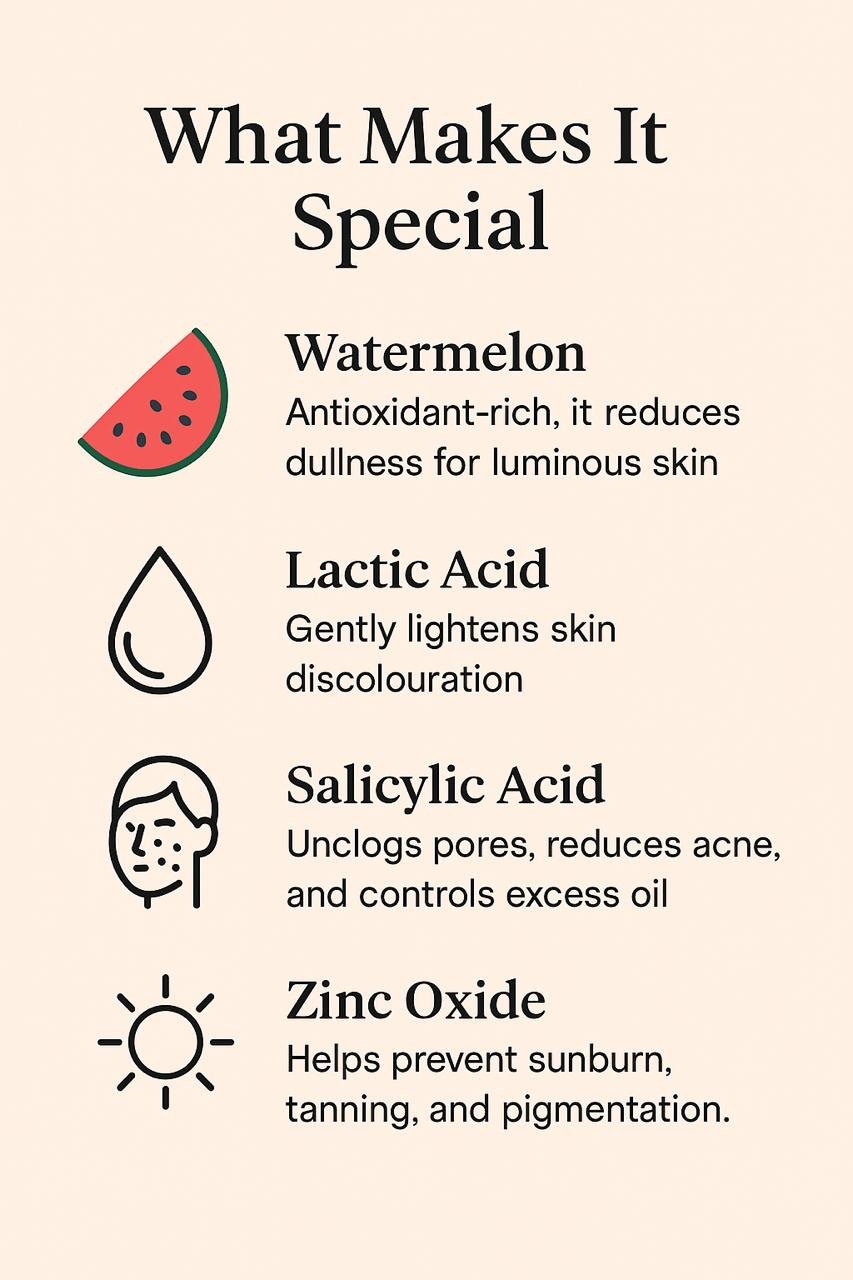 Watermelon Extract and Lactic Acid. It provides deep hydration, evens skin tone,