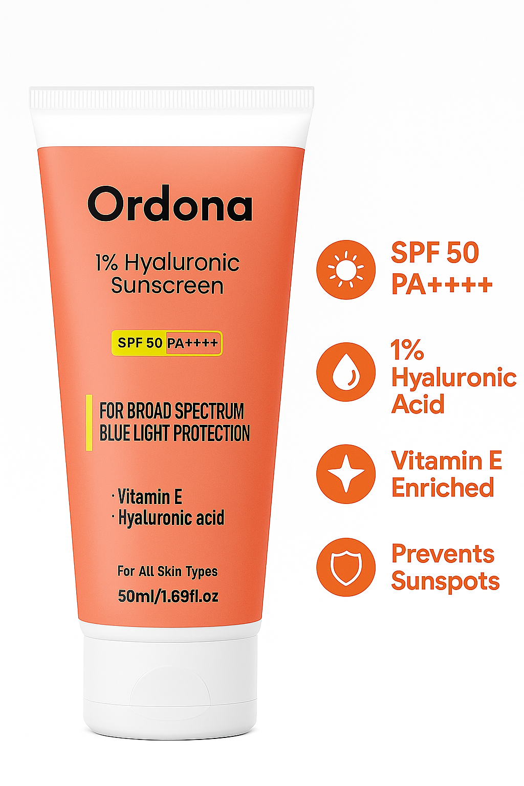Ordona Sunscreen – SPF 50 PA++++ 1% Hyaluronic Sunscreen | Lightweight, Hydrating & Long Lasting Sun Protection (50 ml)